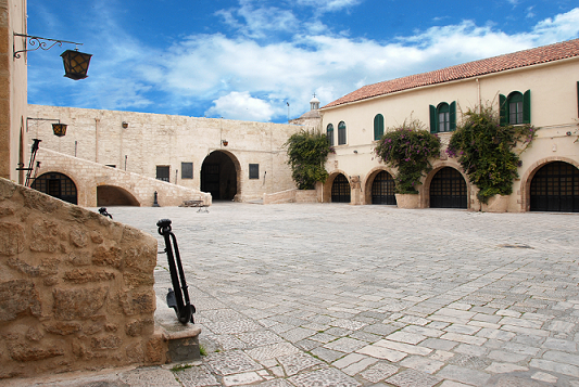 Sul lato sinistro del cortile si aprono locali con volta semicircolare originariamente forse adibiti a caserma e più recentemente a sale mostra.