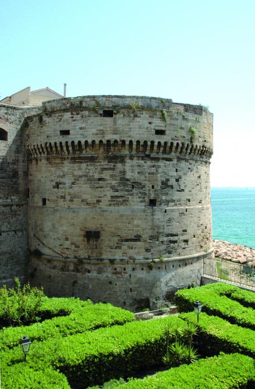 Nel 2001 è stata resa accessibile la parte inferiore del torrione. Ripide rampe di scale, riaperte appunto in quell’anno, portano nella casamatta ubicata alla base della struttura, passando sotto un architrave certamente precedente la ricostruzione aragonese. Questa casamatta di forma quadrangolare, presenta una marcata differenza tra le pareti, di fattura piuttosto primitiva, e la volta a botte costruita con precisione tipicamente aragonese. È ipotizzabile che le pareti siano ciò che resta di una delle quattro torri medioevali che fronteggiavano la città; di forma quadrangolare e vuota all’interno, la costruzione può essere stata incorporata dagli architetti aragonesi nel nuovo torrione rotondo coprendo l’ambiente con una volta per conferire maggiore robustezza alla struttura e per costituire il piano di calpestio del livello superiore. La casamatta è munita di due feritoie, quasi certamente coeve alle pareti, per la protezione della cortina muraria di ponente e di due piccole casamatte laterali poste a 90° l’una dall’altra verso il Mar Grande, di tipologia aragonese. Il piano di calpestio, coperto di mattonelle novecentesche, è collocato a circa 250 cm sul livello del mare, ad una quota un metro superiore a quella riscontrata negli altri torrioni; uno scavo di saggio, condotto sino alla profondità di circa 100 cm, non ha evidenziato alcun tipo di struttura sottostante ma solo carparo incoerente.