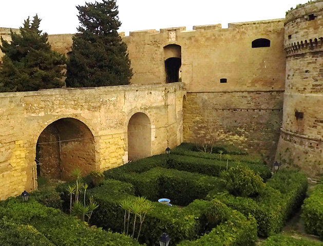La cortina muraria di ponente ha la scarpa alta 15,5 metri dal fondo del fossato (10 e 11,5 metri dal livello del mare) ed è protetta da una casamatta munita di due feritoie, quasi certamente coeve alle pareti, situata nella Torre della Bandiera.